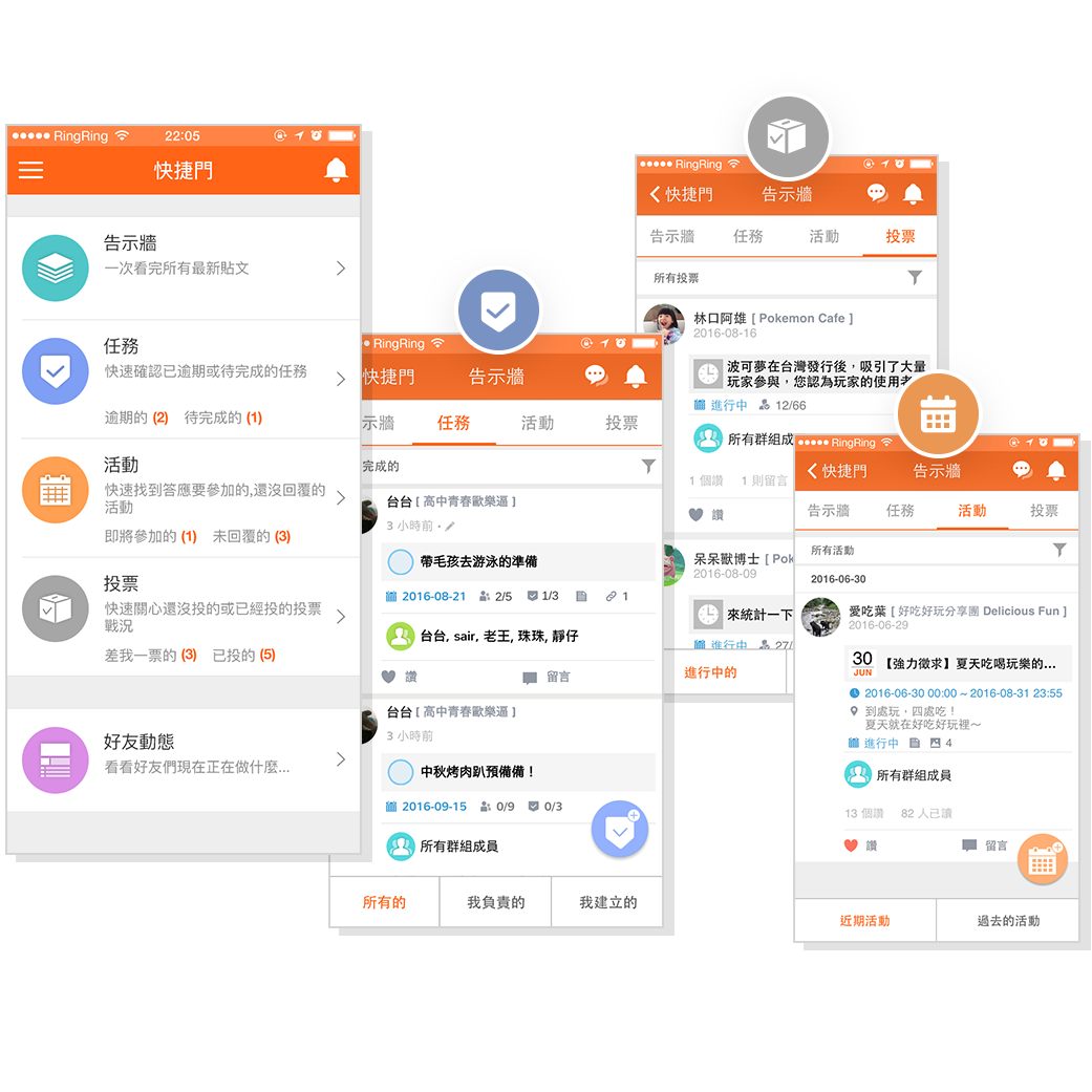 無論是聯繫溝通、分享動態、相簿、組織公告、分工合作、舉辦活動、線上投票、檔案共享、記帳等,